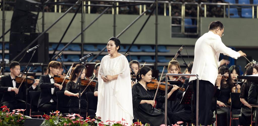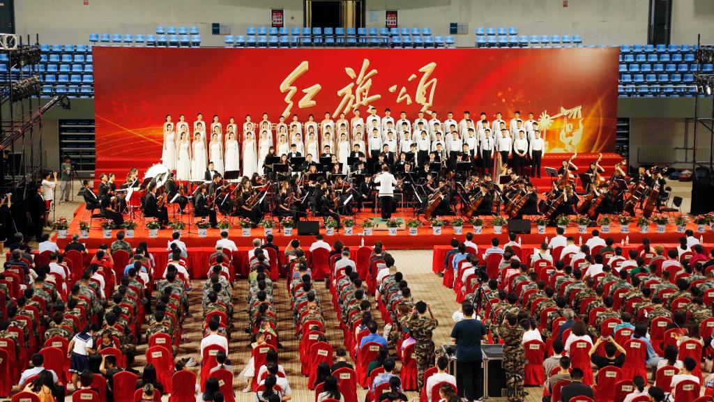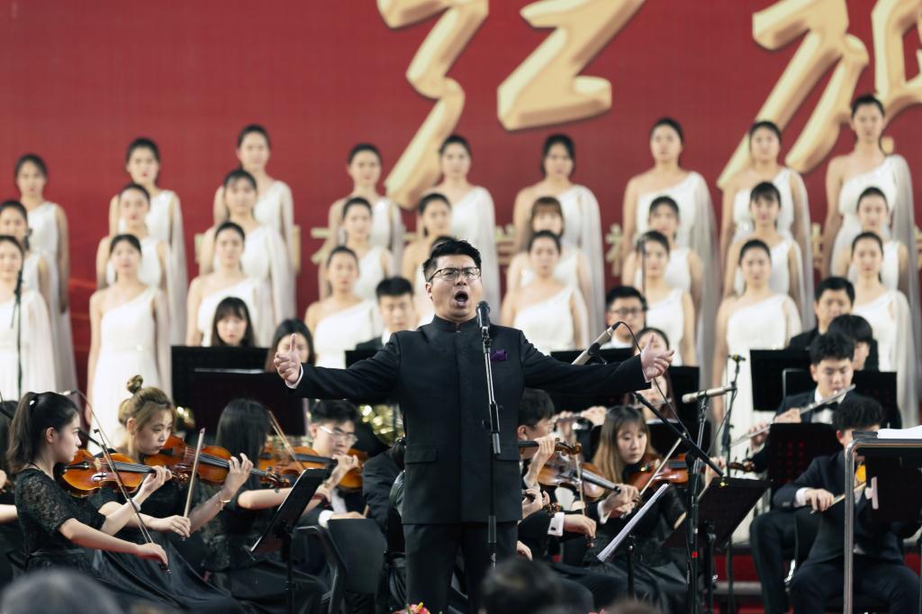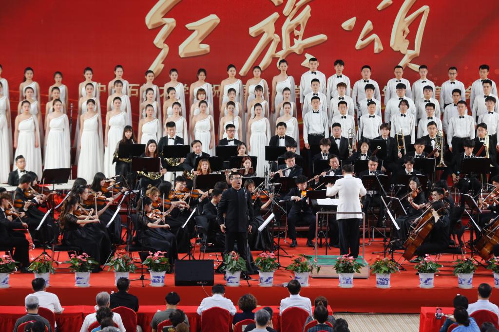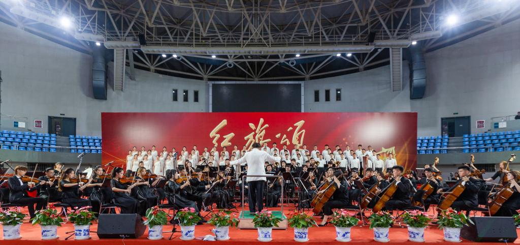 交响音乐会演出曲目安排匠心独具,以昂扬奋进的管弦乐《红旗颂》开场。《红旗颂》被誉为中国音乐史上“不朽的旋律不朽的歌”,以1949年10月1日开国大典为背景,融入了国歌、东方红和国际歌的旋律,宏伟庄严,气壮山河。在国家一级指挥徐学敏教授的指挥下,交响乐团的演奏气势恢宏,铿锵有力,表现了中国人民在红旗指引下,自强不息、战斗不止,奋勇前进的豪迈。
