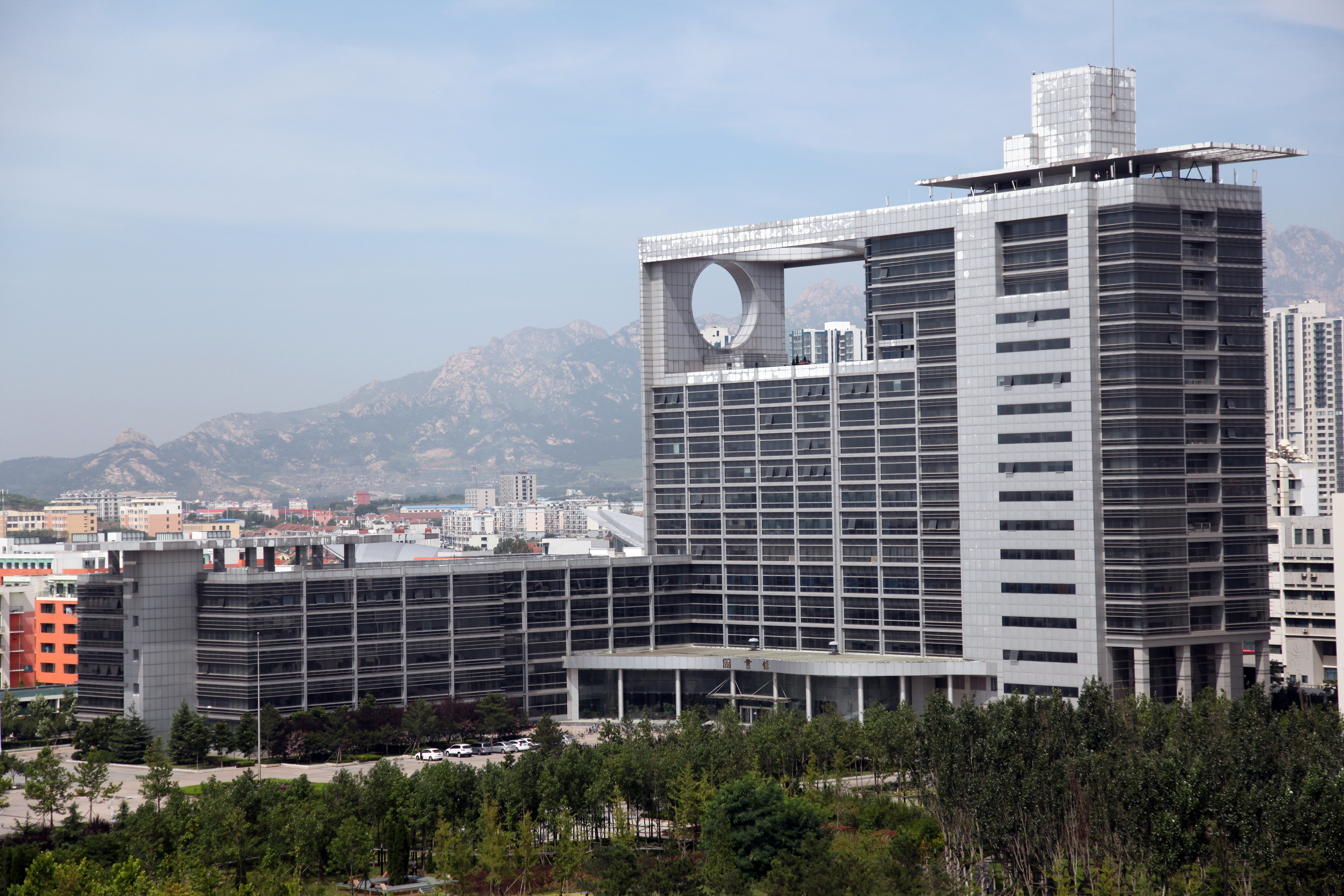 图书馆总馆包括A区1至6层,使用面积为7198平方米(含6层档案馆1529平方米),B区5层书库及书库南端各房间,使用面积9898平方米,总使用面积约1.71万平方米(不含公共面积)。2004年8月12日,第一批图书搬运至青岛校区。8月24日,青岛校区举行校牌揭幕暨大学生入驻仪式,图书馆也正常开馆。