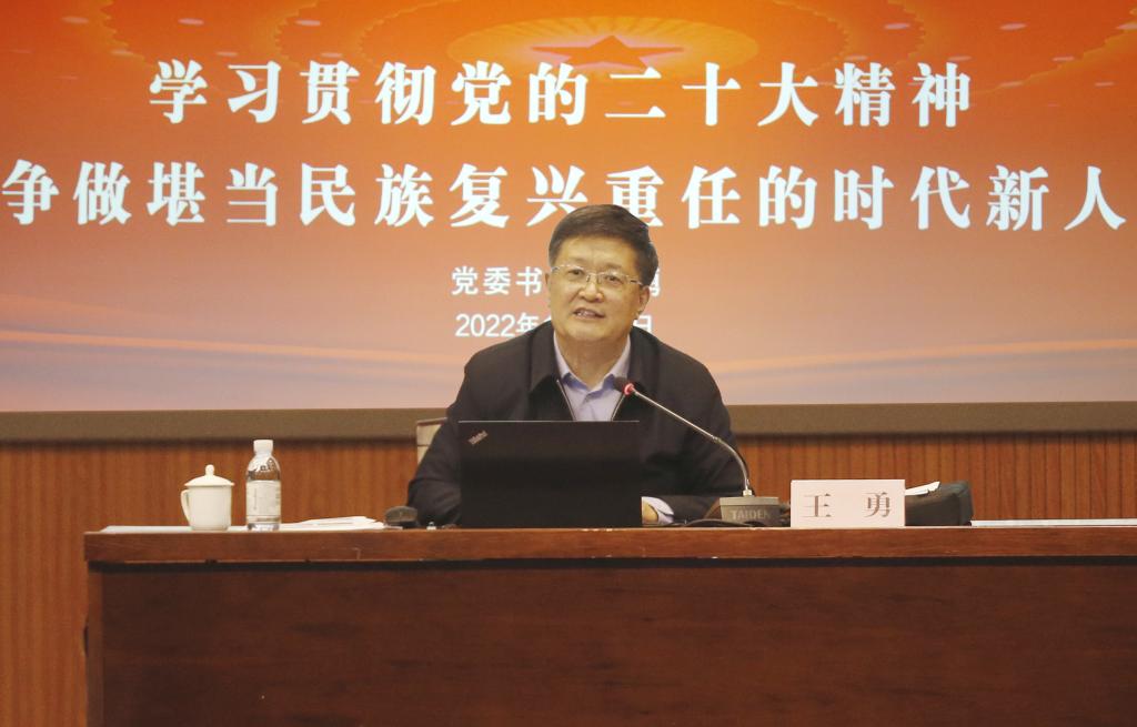 王勇指出,党的二十大是在全党全国各族人民迈上全面建设社会主义现代化国家新征程、向第二个百年奋斗目标进军的关键时刻召开的一次十分重要的大会,学习宣传贯彻党的二十大精神,要牢牢把握过去5年工作和新时代10年伟大变革的重大意义,牢牢把握新时代中国特色社会主义思想的世界观和方法论,牢牢把握以中国式现代化推进中华民族伟大复兴的使命任务,牢牢把握以伟大自我革命引领伟大社会革命的重要要求,牢牢把握团结奋斗的时代要求,做到全面学习、全面把握、全面落实。结合学校发展实际和立德树人根本任务,王勇强调,要深刻理解党中央将教育、科技、人才进行“三位一体”统筹安排、一体部署的战略意义和深远影响,充分发挥好高校作为科技第一生产力、人才第一资源和创新第一动力的重要结合点的独特作用;要深刻理解当代青年的使命任务与责任担当,教育引导学生坚定不移听党话、跟党走,怀抱梦想又脚踏实地,敢想敢为又善作善成,立志做有理想、敢担当、能吃苦、肯奋斗的新时代好青年。