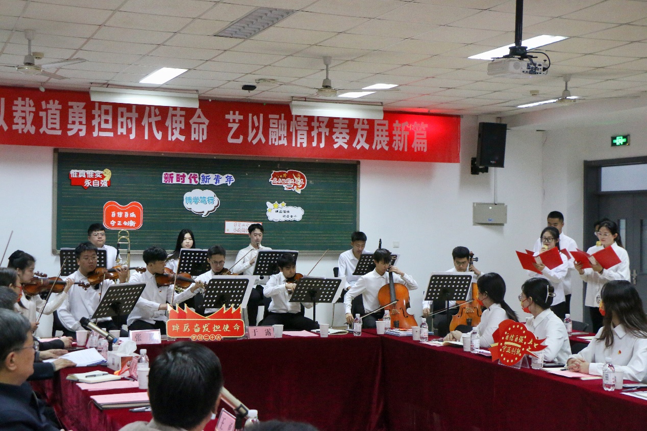 与会师生党员代表发言,表达自己对党的二十大精神的认识与理解。来自汉语言文学和音乐专业的青年学生代表分别从专业学习、社会实践、青春理想、红旗团支部建设等方面分享了自己成长的心路历程与对党的二十大精神的理解。“每当我遇到挫折与坎坷,我都会想起提交入党申请书时的那份坚定的信念。也正是因为这份信念支撑着我,让我始终保持着积极的心态面对一切困难”,汉语音乐专业学生第二党支部书记、校学生会主席团成员、音乐学(管弦)1902王家琪如是说。中文系党支部书记张欣、音乐系主任苏静等教师代表分别从未来人才培养方向、专业学科建设、学院工作与学院建设、文化传承、创作与创新等方面谈到了自己的心得体会与感受。