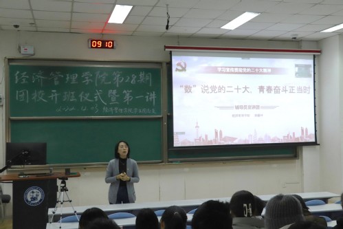 “数”说党的二十大,青春奋斗正当时。在经管学院第28期团校暨青年马克思主义者培养工程基础班开班仪式上,经管学院团委书记唐丽坤向在场学员开展团课第一讲。她以党的二十大新闻中心第一次集体采访为引,号召学员关心政治、关心时事,提升政治素养,坚定理想信念。随后,她从“数”说新时代非凡十年、“数”说新征程宏伟蓝图、“数”说新使命青年担当三部分展开具体讲解,展现了十年来的伟大成就,鼓励学员向先进榜样学习,以青春之名,担青春之责。