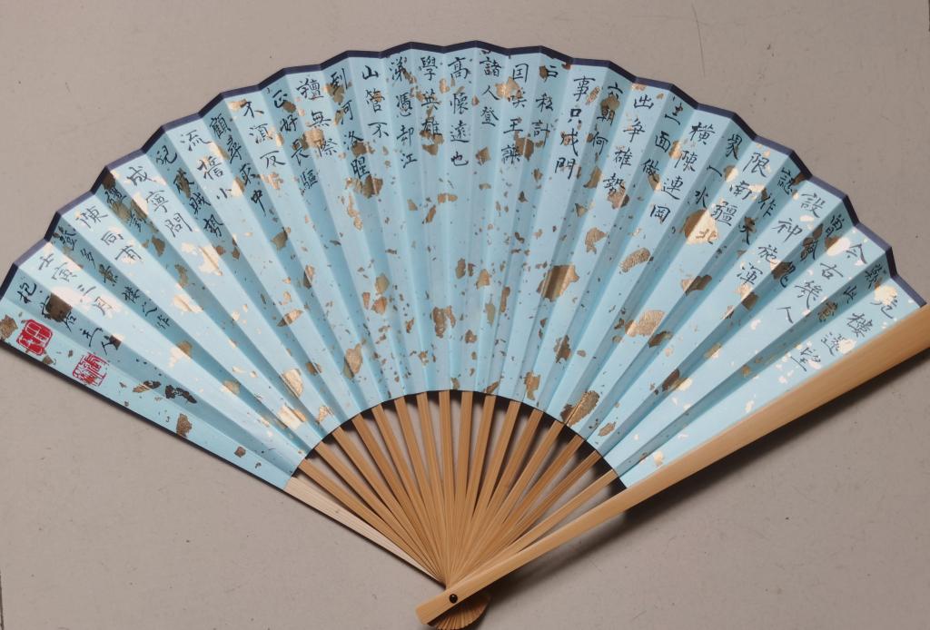 图为“墨笔丹青,一纸两岸”书法、绘画作品征集活动优秀作品,扇面书法《念奴娇·登多景楼(陈亮)》,田张裕书。