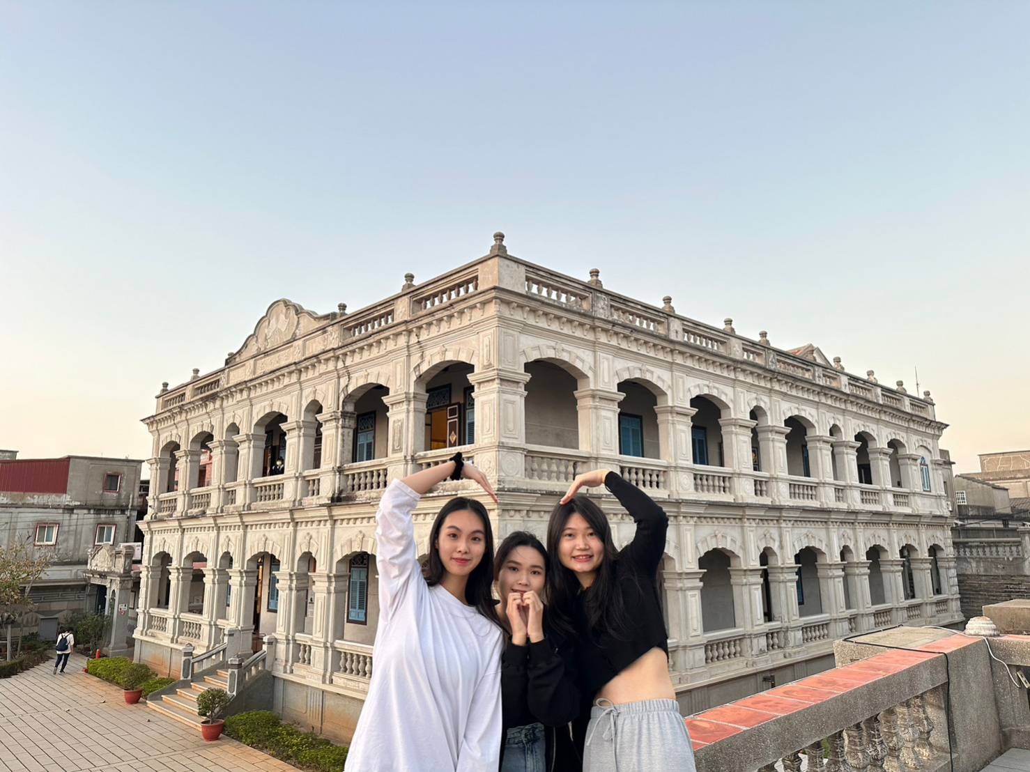 图为“千里云相会”合照打卡活动作品《番仔楼》,台湾金门大学的黄小娟、刘千华、刘怡秀在陈景兰洋楼精致的雕花与对称拱门前“比心”合影留念。