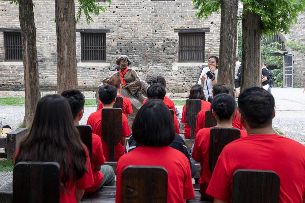 研学营营员聆听讲解员讲解抗日故事