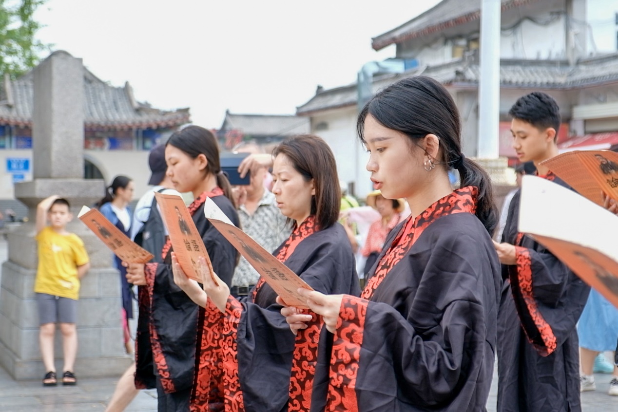 研学营营员在曲阜孔庙拜师礼上颂读论语