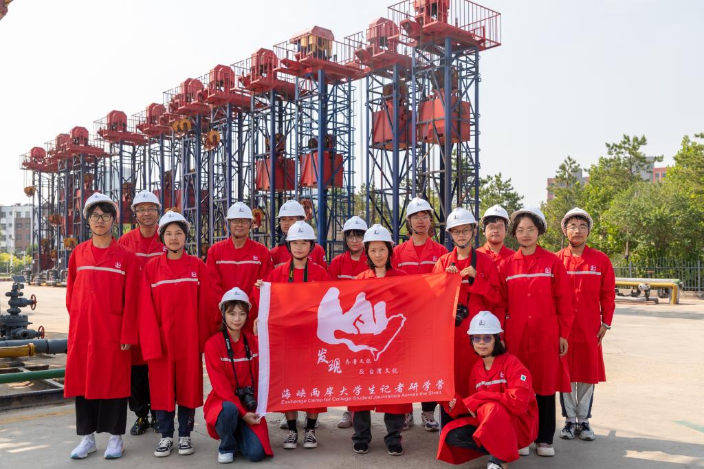 研学营营员们前往营1丛式井组,实地体验石油开发过程。“戴上安全帽,穿上红色的安全服,踏进井场,石油工人的骄傲油然而生。”我校石油工程学院周志强在这次研学中见到了以前从未见过的外转子电机曳引抽油机,他在和采油工人的交谈中学到了书本上没有的知识,并结合自身专业为台湾同胞现场普及了石油知识。