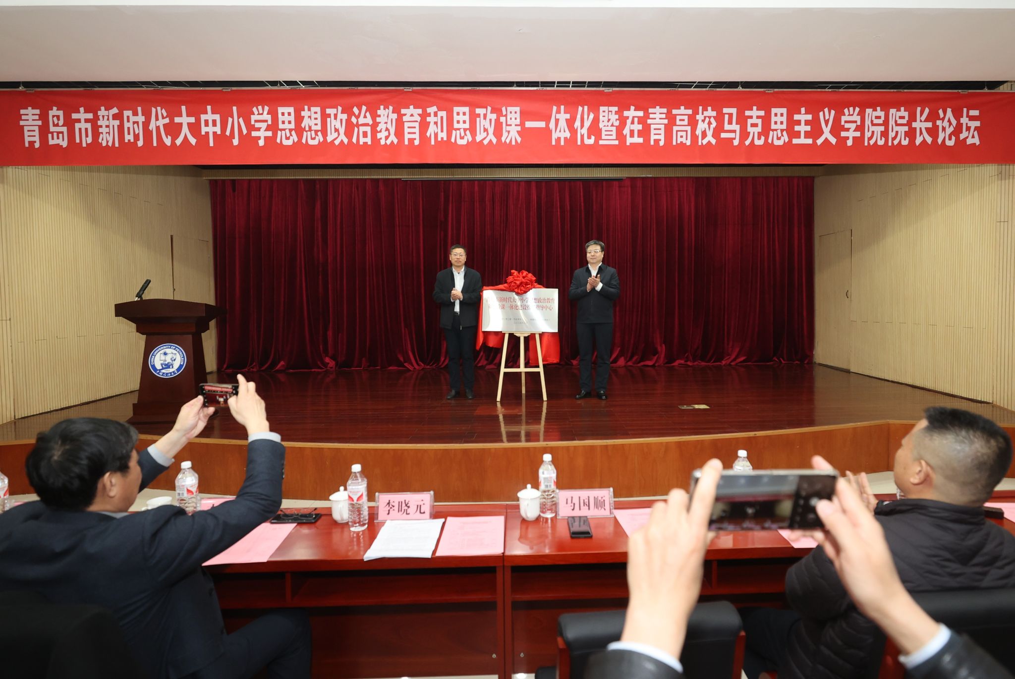 3月23日,“青岛市新时代大中小学思想政治教育和思政课一体化建设推进指导中心”(以下简称“指导中心”)揭牌仪式在我校举行,学校党委副书记马国顺、青岛市教育局总督学李晓元共同为指导中心揭牌。指导中心领导成员,全市各大中小学思政课一体化建设共同体单位负责人、高校马克思主义学院院长、师生代表等200余人参加仪式。