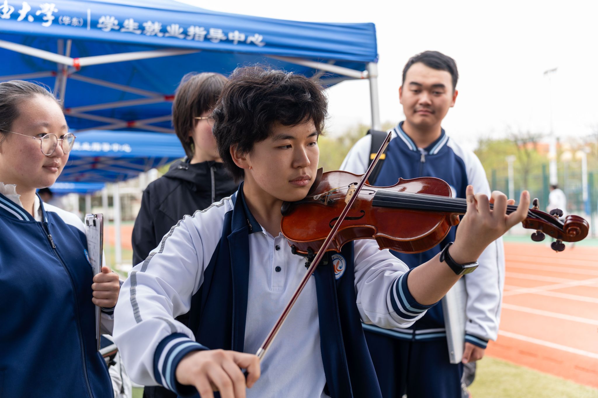 西海岸第一中学学生体验大学生艺术团弦乐队活动 潘浩摄影