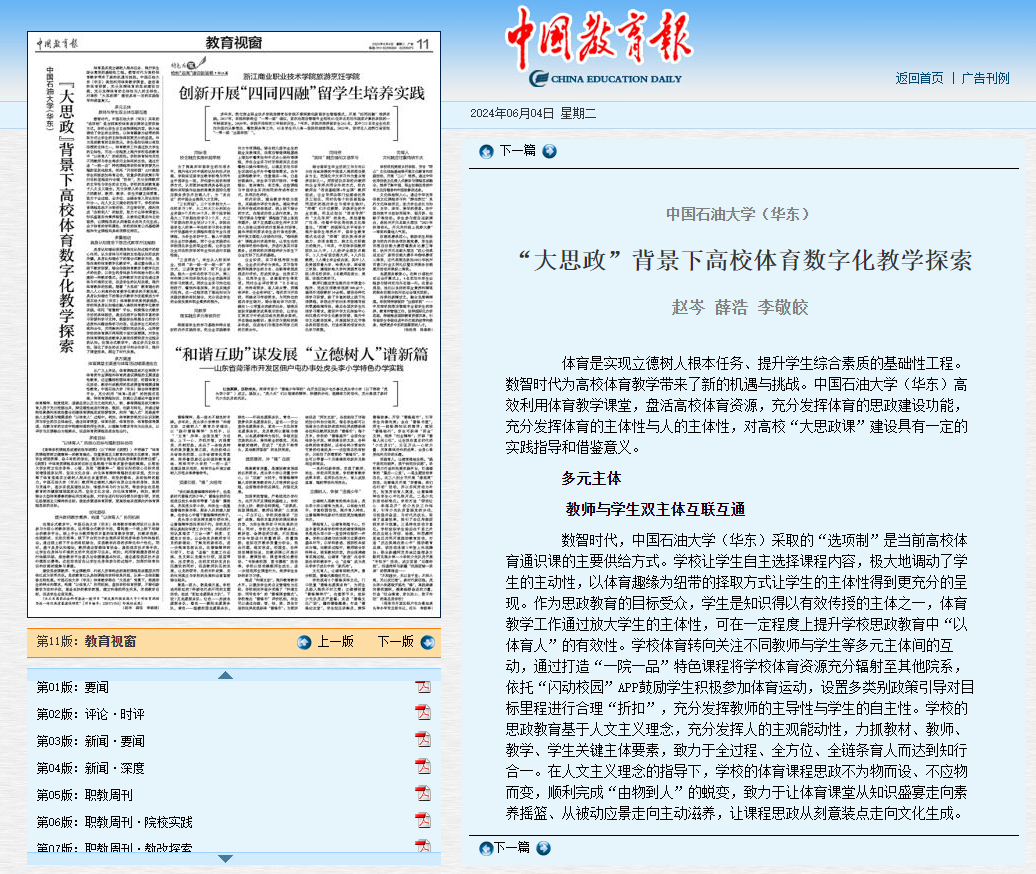 体育是实现立德树人根本任务、提升学生综合素质的基础性工程,数智时代为高校体育教学带来了新的机遇与挑战。6月4日,中国教育报以“bwin·必赢(中国区)官方网站-officialswebsi(华东):‘大思政’背景下高校体育数字化教学探索”为题,聚焦报道我校近年来有效整合体育教育资源、创新教学方式、促进“大思政课”建设的典型做法。