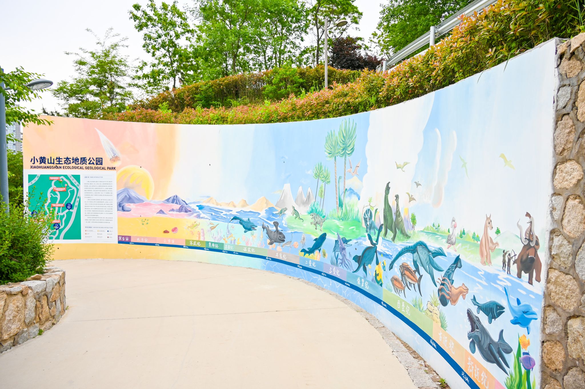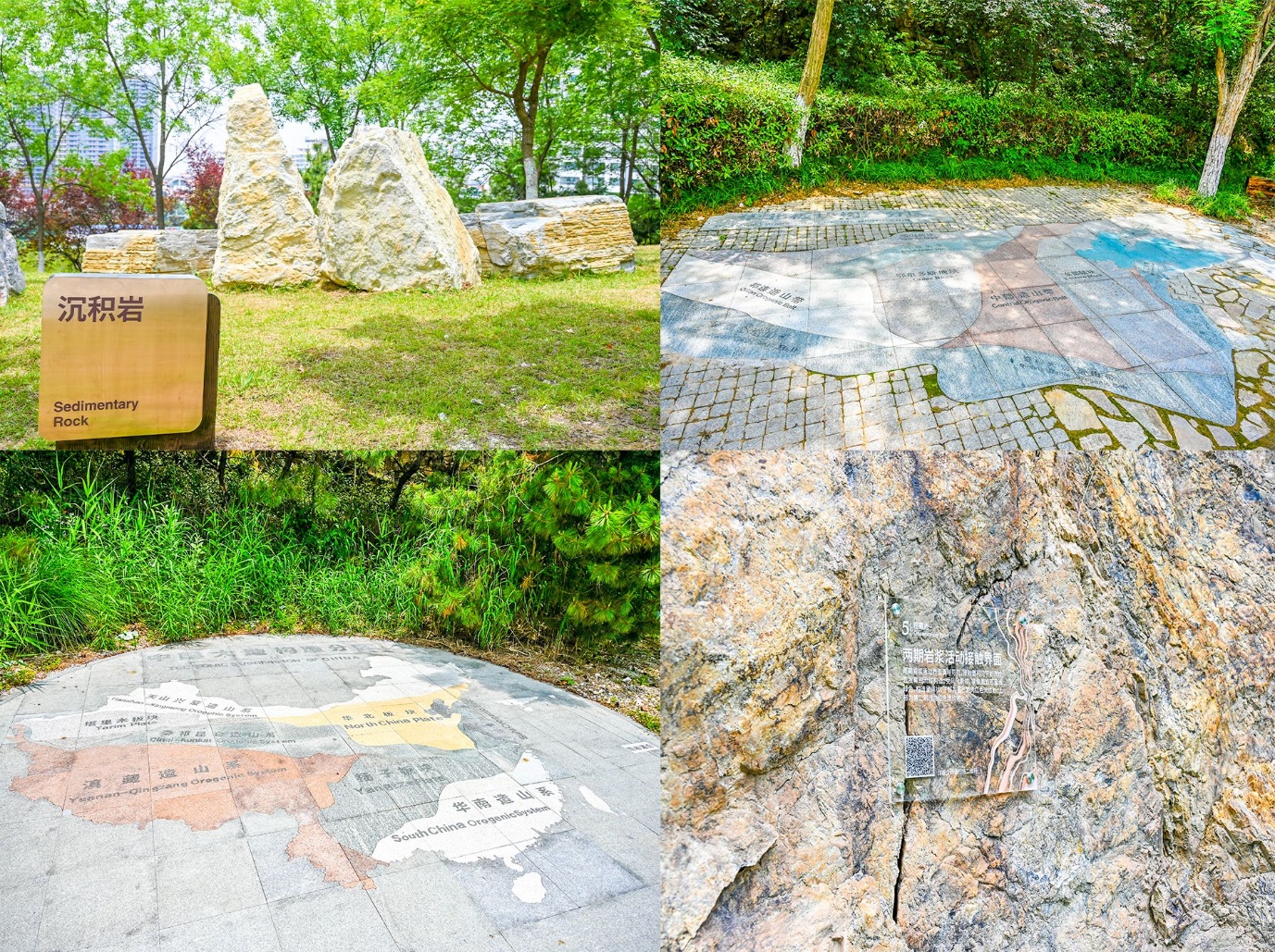 小黄山生态地质公园一期建设依托地球科学与技术学院地质学专业开展,前后历时九个月,建成了地球生命演化史、全球板块分布、中国大地构造、华北克拉通构造分区等4个重点区域,沉积岩、岩浆岩、变质岩等岩石展示区以及7个地质现象观察点。为方便观赏,每个区域和地质观察点分别制作了地质现象解释标识牌,师生、周边市民扫描二维码即可深入了解相关地学科普知识。