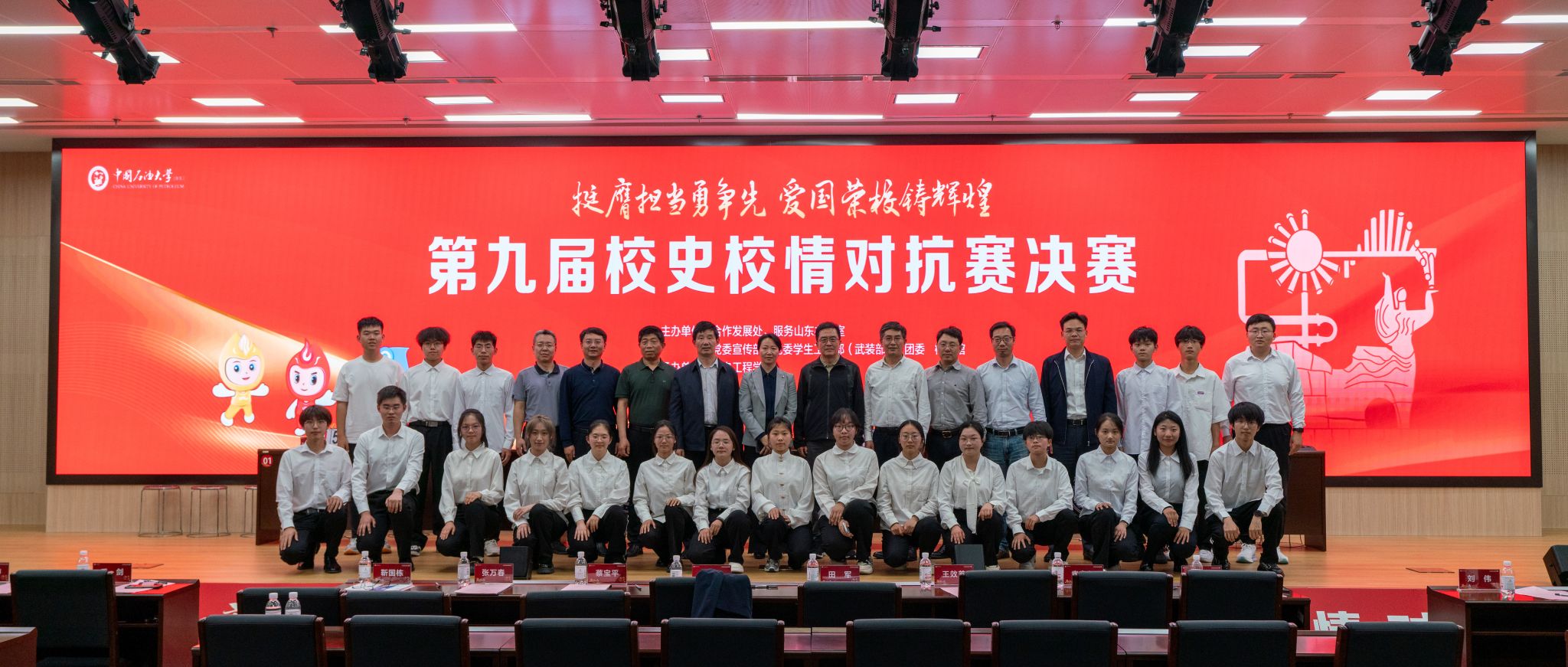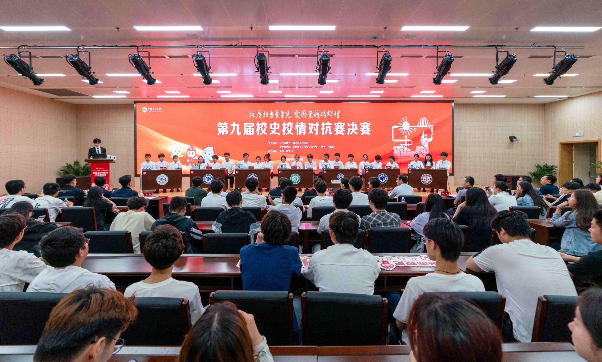 为弘扬石大精神、普及校史文化,增强学生对学校的归属感、自豪感,激励广大青年学生、校友知校史、扬校训、明初心,为国家能源战略和区域经济发展贡献青春力量,5月29日,由合作发展处、服务山东办公室,党委宣传部,党委学生工作部(武装部),团委,档案馆主办,机电工程学院承办的“挺膺担当勇争先 爱国荣校铸辉煌”第九届校史校情对抗赛决赛在图书馆(东馆)第一会议室举行。7支学院队伍分三个环节参与比拼,为师生带来一节生动有趣的校史课。