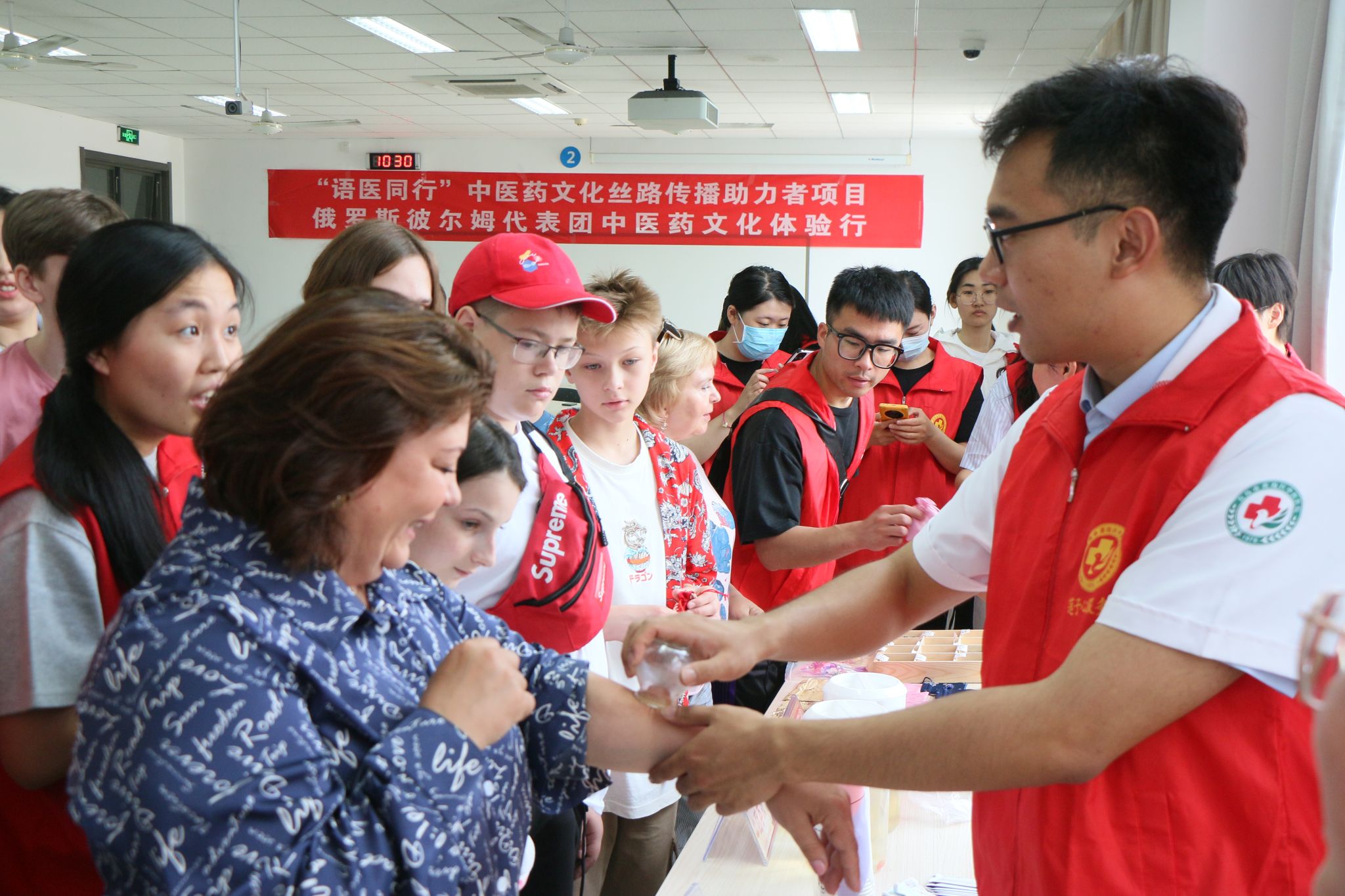 在志愿服务中,外国语学院还注重中华优秀传统文化的对外传播。第五届山东省青年志愿服务项目大赛金奖获得者——“语医同行”志愿服务队长期致力于在“一带一路”国家传播中医药文化。今年6月,俄罗斯彼尔姆化学技术中学的代表团来访我校,“语医同行”志愿者们带领代表团亲身体验八段锦、制作香囊、共饮中医养生茶,代表团领队鲍里斯短短几天时间就与志愿者们结下了深厚的感情,他在离别贺卡上写下“感谢石油大学的朋友们带我们领略中医药文化的神奇魅力!”