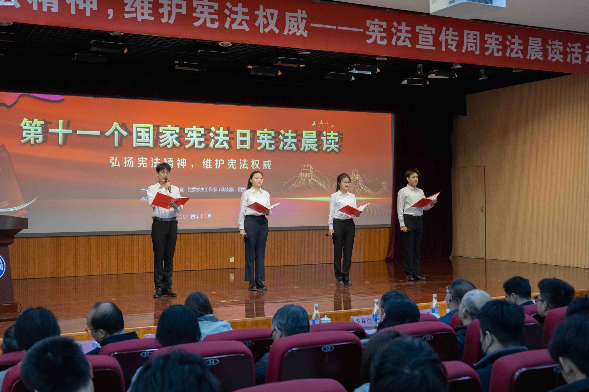 活动由法治办公室、党委学生工作部(武装部)、团委主办,文法学院承办。文法学院院长王学栋教授领读宪法条款,全场师生同步跟读,共同感受宪法的权威与神圣。文法学院学生带来宪法主题歌曲《宪法伴我们成长》以及朗诵《宪法在我心中》,展现了当代青年学生践行宪法的决心和信念。国家奖学金获得者、法学专业田一何作为学生代表发言,呼吁广大学子共同学习宪法、遵守宪法、捍卫宪法。活动现场还为第九届“学宪法 讲宪法”比赛获奖学生颁奖。