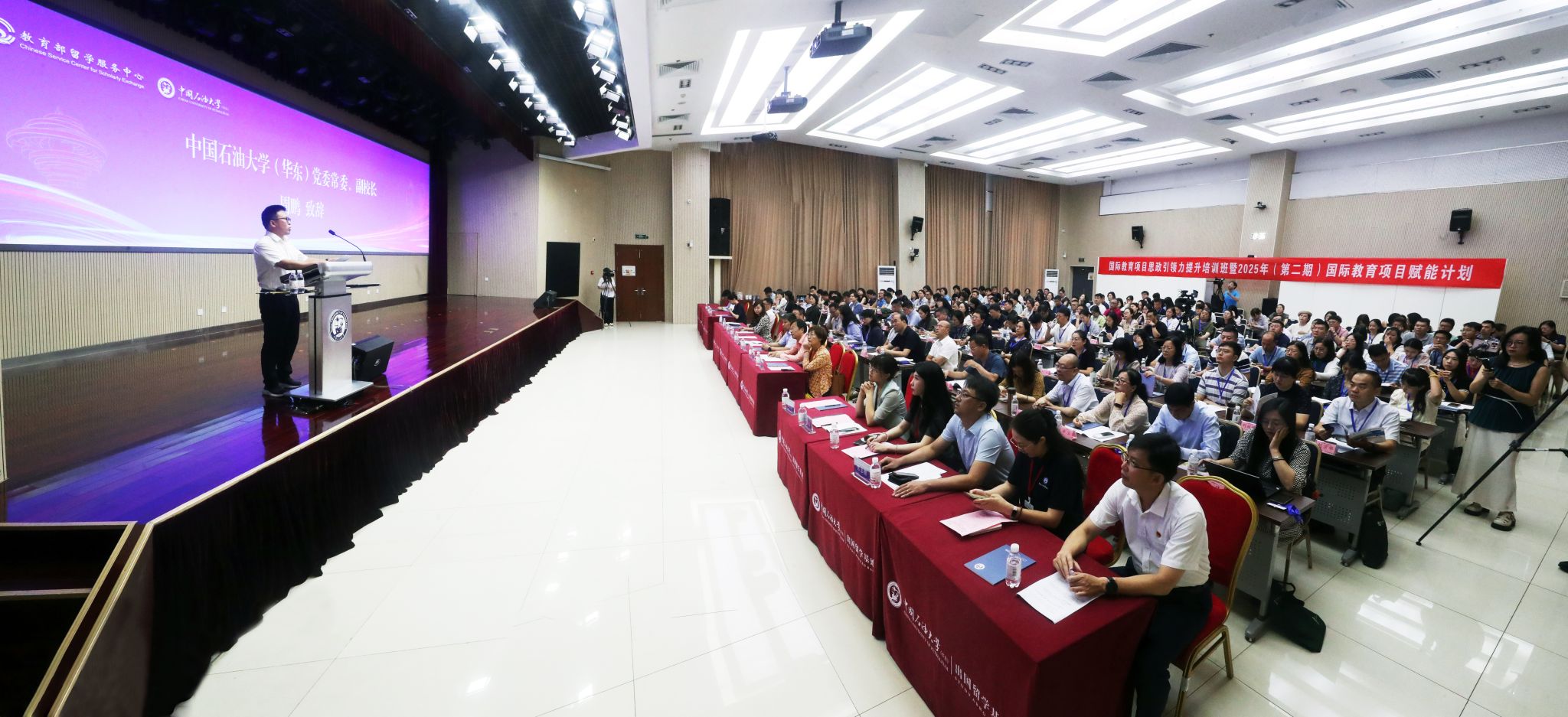 为应对复杂国际环境下的留学新挑战、筑牢国际化人才思想政治根基,由教育部留学服务中心主办、bwin·必赢(中国区)官方网站-officialswebsi(华东)承办的“国际教育项目思政引领力提升培训班”于7月30-31日在青岛成功举办。来自全国77所高校的175位国际教育项目负责人齐聚一堂,聚焦“锻造强大的思政引领力 推动国际教育项目高质量发展”主题,深入探讨思政教育赋能国际化办学的方法路径,着力培养具有浓厚家国情怀、广阔国际视野的优秀人才。教育部留学服务中心副主任夏建辉、我校副校长周鹏出席活动并致辞。