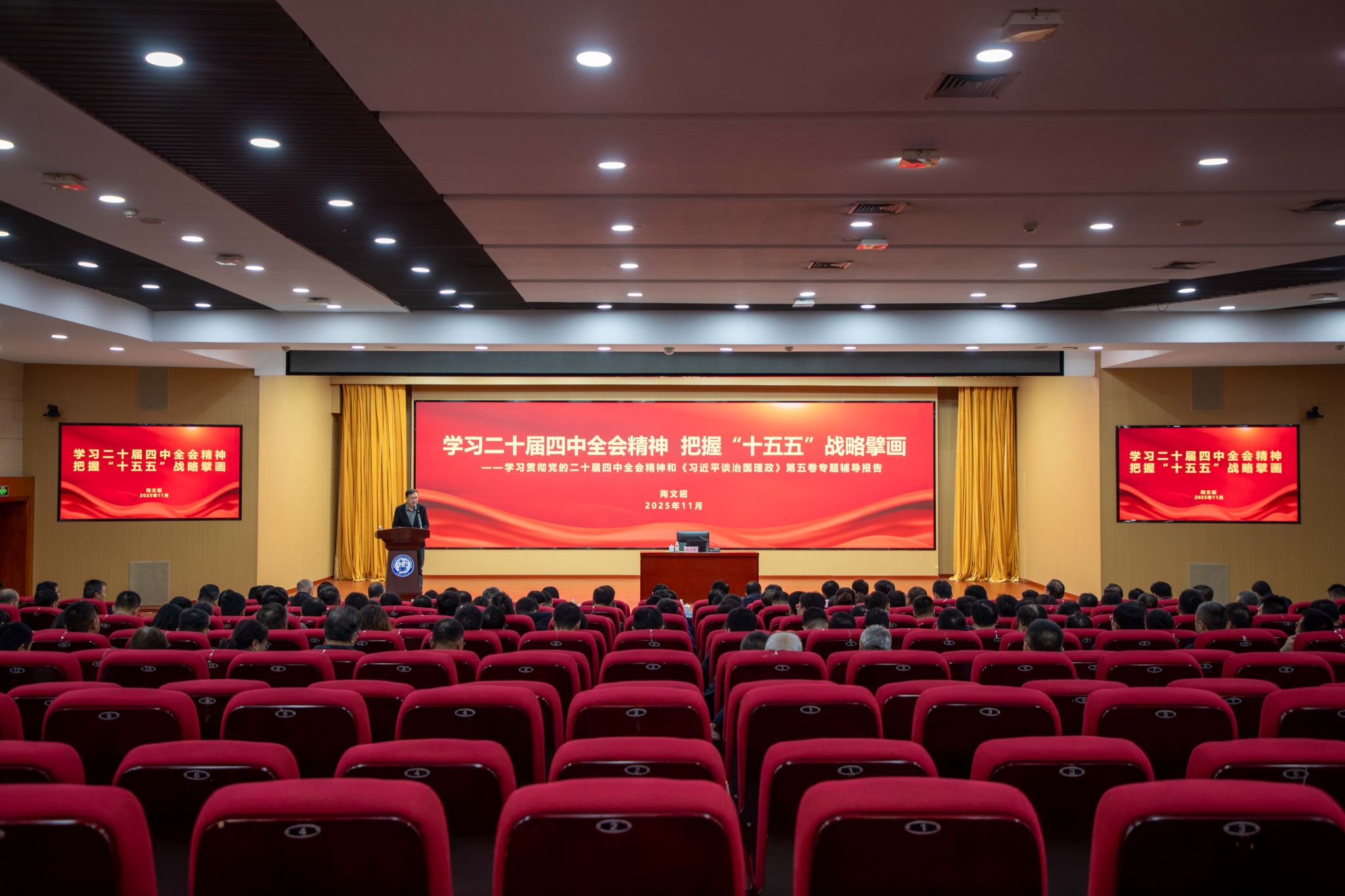 11月5日,学校举行党的二十届四中全会精神专题辅导报告会,邀请中国人民大学陶文昭教授作《学习二十届四中全会精神 把握“十五五”战略擘画》专题辅导报告。党委书记吴强明,副校长张玲玲,党委副书记万云波,党委副书记、纪委书记刘珂,党委常委赵放辉、蒋文春,校长助理于连栋出席会议。万云波主持会议,校院两级党委理论学习中心组成员、全校中层干部、各民主党派负责人、马克思主义学院教师、辅导员参加会议。
